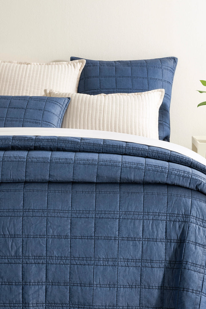 Simple and practical like your favorite pair of jeans, this quilted bedding layer goes with just about anything. The perfect way to add warmth to any bed, this dark rinse micro denim quilt is light, cozy, and made for all-season snuggles. Double stitching defines the checkerboard quilting, combining the technical Tencel fabric and a thin layer of batting. The superfine twill weave is silky chic and supple soft with a cool smoothness, for an edgier, all-year extra layer.