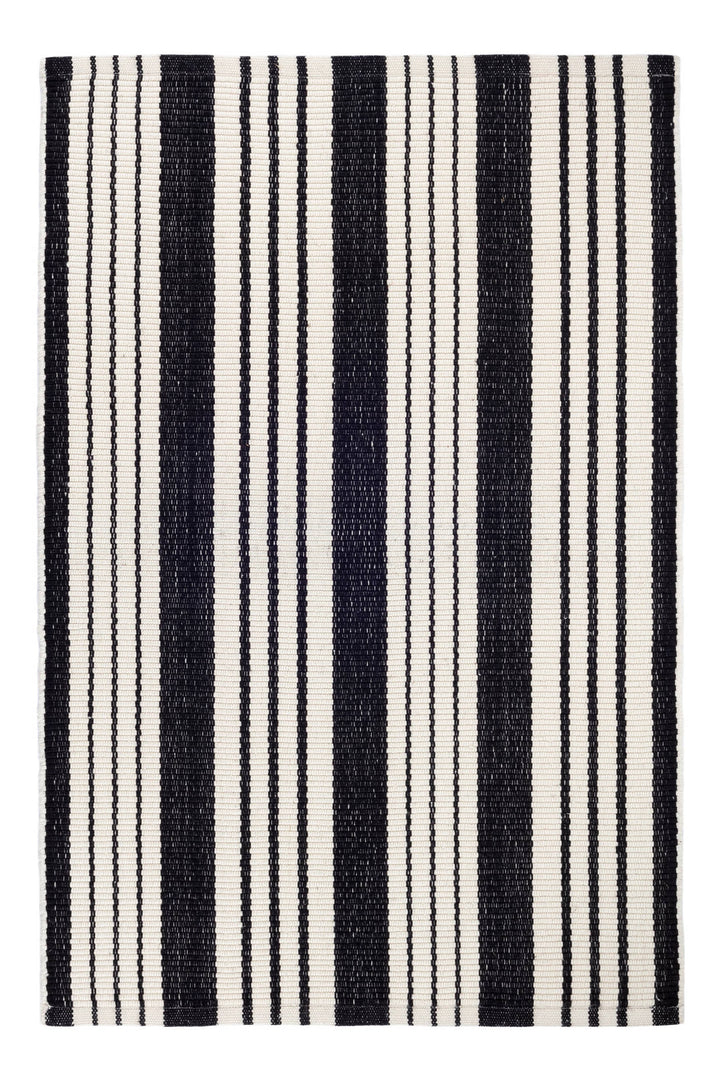 Get the best of both worlds with this durable, washable, and eco-friendly indoor/outdoor rug in a classic black and ivory stripe. Blends beautifully into both traditional and modern spaces.