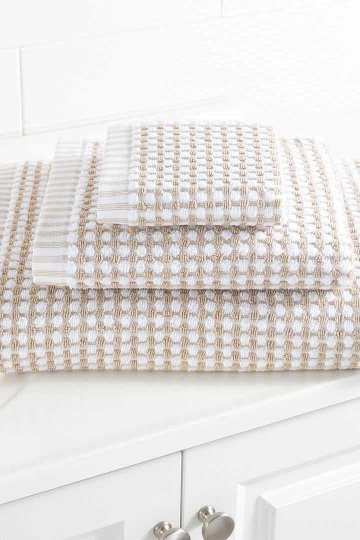 Plush and absorbent, these charming all-cotton towels are made of uncut loops dotted on a white base with end-on-end striped hems. Made in Turkey and constructed of premium Turkish cotton that has extra long fibers and becomes even softer and fluffier with successive washings.