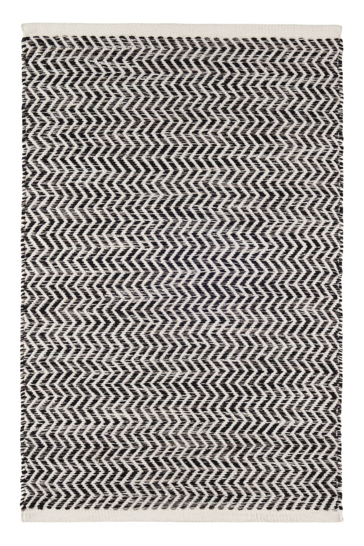 This eco-friendly and washable rug is handwoven in easy-care, soft-handed performance yarns that stay beautiful indoors and out. The marled black and ivory ground is overlaid with graphic white textured chevrons to give this classic herringbone design a new rhythm and movement. Another classic sun, rain, dog, and child-proof rug design, sustainably made from recycled water bottles with fair labor practices.