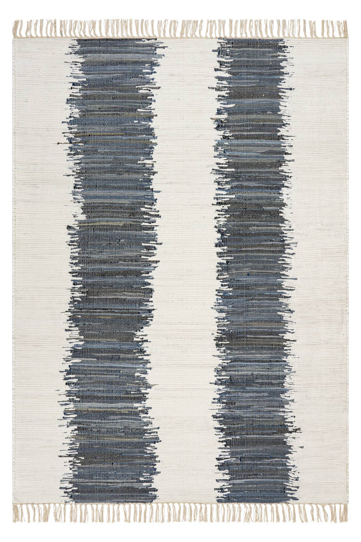Soft denim‑hued bands create a relaxed sense of movement against a light, neutral ground. Handwoven texture finishes with fringe for an easy, refined touch.