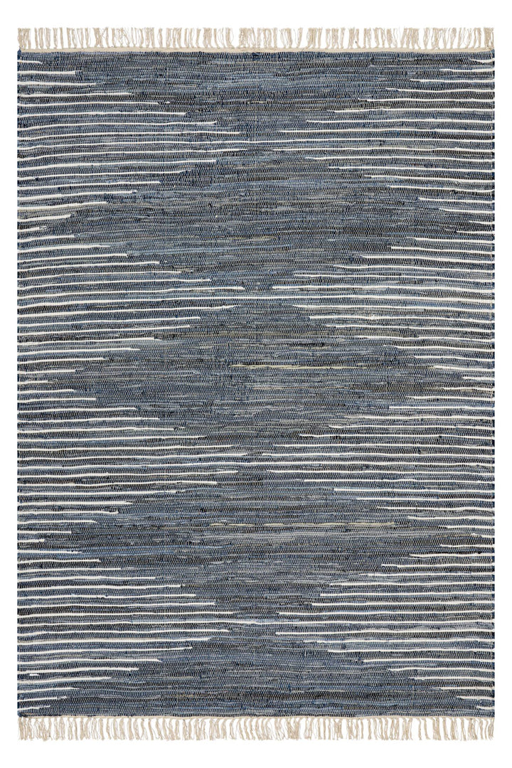 A tonal field of denim develops dimension through softened variation and tactile texture. A handwoven construction is complemented by subtle fringe for an understated finish.