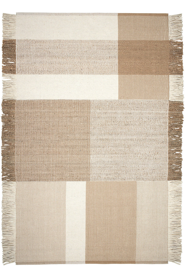 A fresh and modern play on vertical and horizontal stripes, woven in strips and sewn together for a unique effect. In raw, natural heathered shades, this heftier flatwoven rug's rich texture and muted tones derive from a blend of cozy wool, hardworking jute, and soft cotton. Finished along the sides with an alternating chunky felted wool and substantial natural twisted jute fringes.