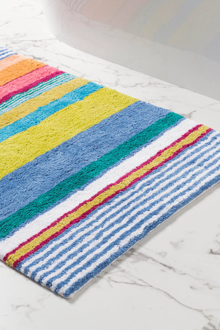 A better pick-me-up than that morning cup of joe: Step out of the shower and be greeted by one of our favorite stripes! Variegated stripes in sun-drenched hues – Coral, Sky, Grassy Green, French Blue, Guava, Forest, and Lavender – are inspired by our best selling Mellie flatwoven cotton rug. Densely tufted for cloud-like softness underfoot from a densely plush and substantial long-staple cotton.