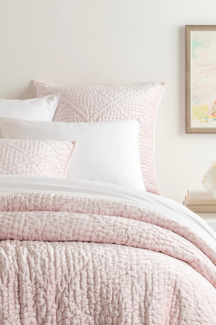 Love at first touch, you will melt at the hand feel of this sublimely soft-to-the-skin scrumptious quilt. Relaxed and inviting, double diamond Kantha quilted cotton velvet. Layer on the romance, with velvet for every season.