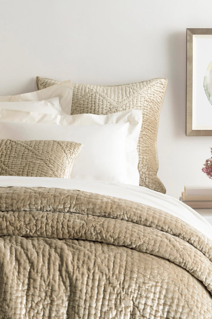 Love at first touch, you will melt at the hand feel of this sublimely soft-to-the-skin scrumptious quilt. Relaxed and inviting, double diamond Kantha quilted cotton velvet. Layer on the romance, with velvet for every season.