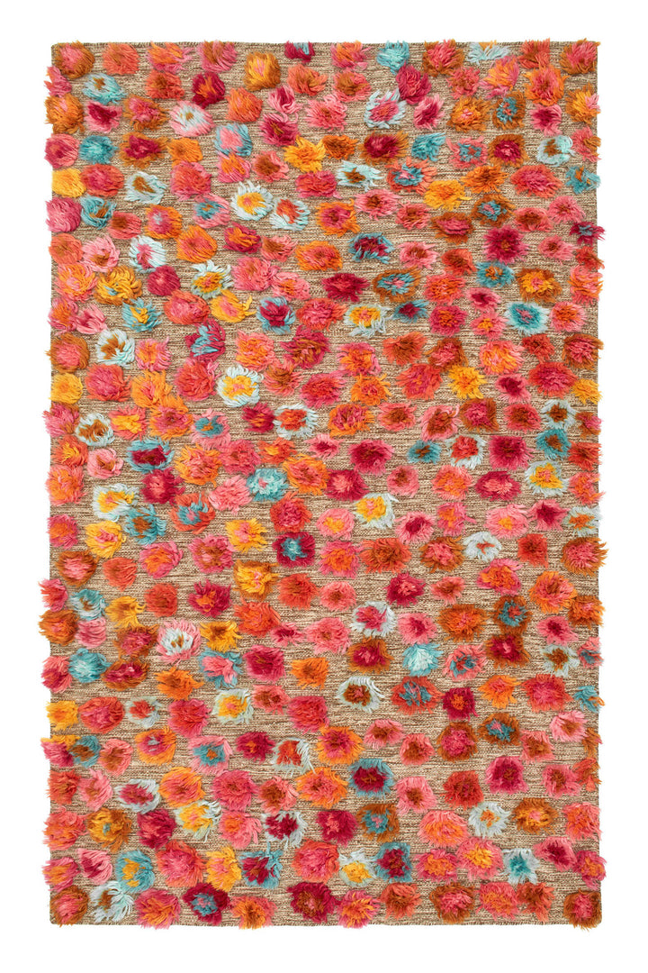 This exuberant, shag-tufted wool rug is guaranteed to bring the house down. Colorful blooms of saffron, fuschia, aqua, teal, and more flourish on an undyed marled background. Plush and pleasing underfoot, its hand-knotted construction makes it perfect for low-traffic rooms.
