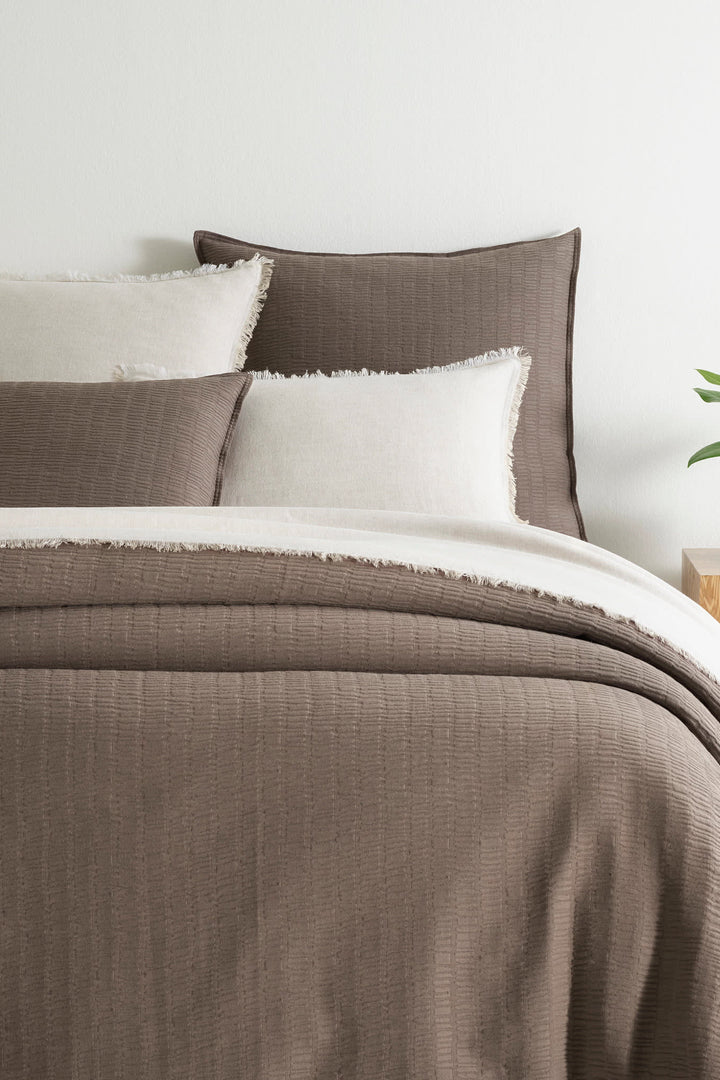 With its tempting texture and sensuous feel, the rhythmical, irregular design of this cotton matelassé coverlet conjures ancient sea fossils. Meticulously woven for us on jacquard looms, the double layer cloth has raised pockets that deliver extra nighttime insulation and is laundered to lived-in comfort. Offered in an earthy range of deep mineral shades, a signature rich neutral palette of Marie Flanigan, an award-winning interior designer and Principal of Marie Flanigan Interiors.