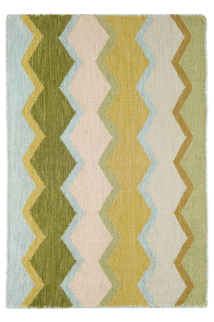 Geometric rik-rak lines in atmospheric tonal hues create a bold presence. This uniquely patterned washable indoor/outdoor rug is flatwoven from resilient recycled P.E.T. performance threads that feel as soft as cotton but will stand up to whatever everyday life brings its way. Designed by Kit Kemp, Founder and Creative Director of Firmdale Hotels, in collaboration with Annie Selke.