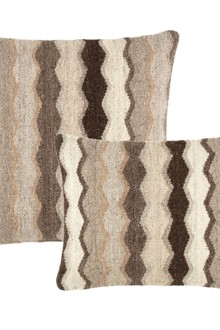 Foundational geometric rik-rak lines encapsulate atmospheric tonal hues, reflecting the everchanging light on the ocean, as colors shift according to season, and time of day. Each unique colorway is interpreted to create a bold presence in a room without overpowering it. Kilim flatwoven wool rug cushions, inspired by the hand-knotted fishing nets flung over the sides of boats in the harbors of Barbados. Designed by Kit Kemp, co-owner and Creative Director of Firmdale Hotels, in a collaboration with Annie Selke.