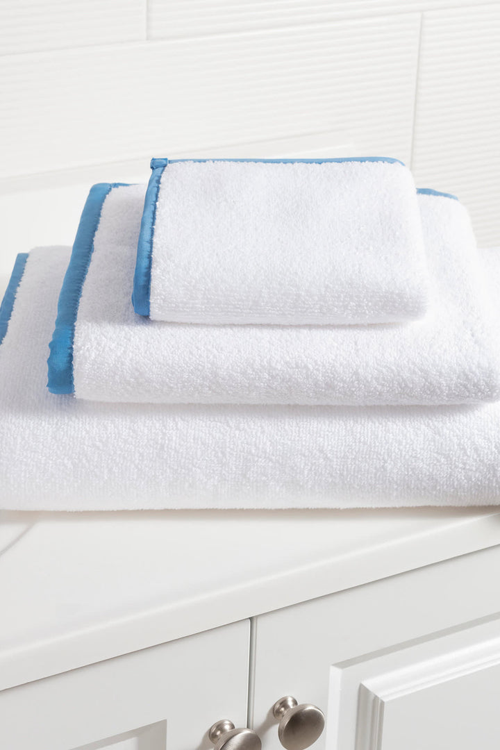 A superabsorbent, luxurious cotton bath towel is punched up with a single band. Made to coordinate with a variety of colors from light neutrals to dark moody greys and every hue in between.