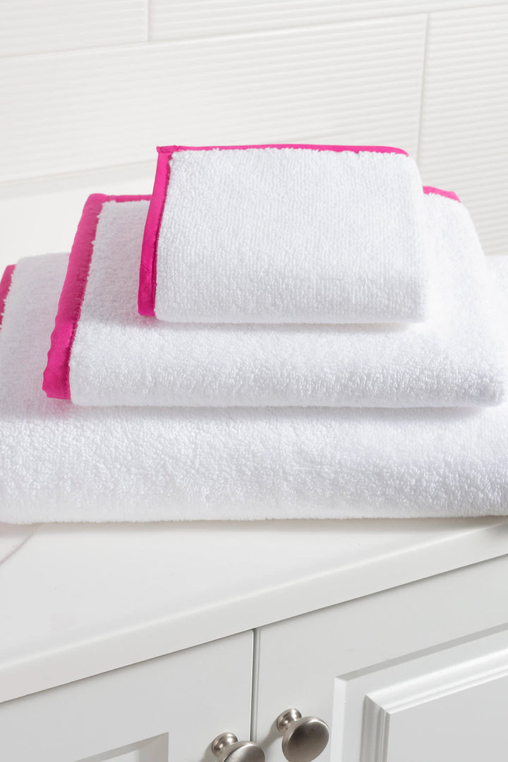 A superabsorbent, luxurious cotton bath towel is punched up with a single band. Made to coordinate with a variety of colors from light neutrals to dark moody greys and every hue in between.