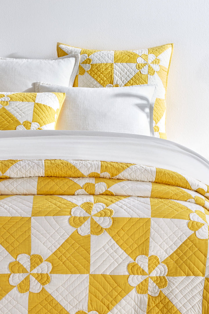 Inspired by an antique textile foraged at Brimfield flea market, we've given traditional a graphic twist. A lightweight patchwork of silky cotton sateen fabric shapes held together with traditional quilting diamonds and sweet petal stitched rosettes; this Modern Americana Quilt is sure to become a family heirloom.