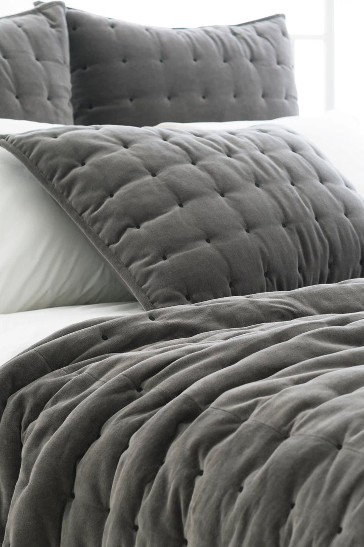 Indulge in a little 'me time' with this cozy cotton quilted sham in lush velvet. Featuring beautiful embroidery on a grey background, this sham is the perfect way to add subtle, luxe texture to any bed.