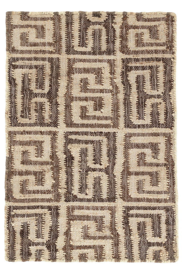 In her latest capsule collection, Annie's friend and collaborator Bunny Williams was inspired by the unique geometric Kuba weaving of central Africa. The sacred Kuba designs are mathematical and rhythmic in vegetable-dyed earth tones and evolved from a number of techniques featuring flat weaving and cut pile, with patchwork, embroidery, and appliqué. The Auricula dhurrie weave rug has a natural jute greek key-like motif woven onto alternating rectangles of brown and natural. Translated with hard working jute fiber, this modern and timeless rug is sophisticated and practical, especially for high traffic areas.