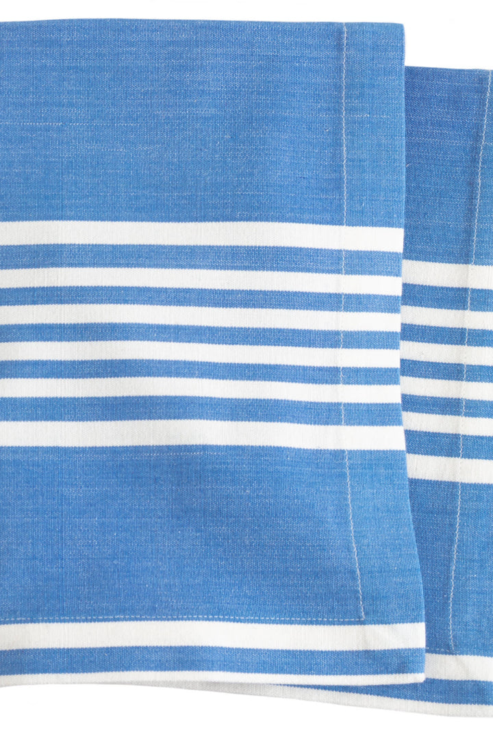 Happy colors and chic stripes give our oversized, handwoven, softly laundered cotton napkins their tabletop brightening style. In Coral, Indigo, French blue, or Platinum with cream-colored woven stripes. Generously sized for total lap protection, they also double as tea towels, so consider buying extra sets to coordinate your kitchen and table. Sold as a set of four.