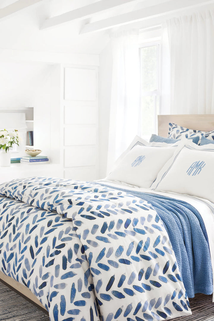Stipples from a loaded blue inky brush in herringbone patterns, each brushstroke individual, like a fingerprint, indicating slightly different pressure. The illusion is of bespoke, handpainted fabric. The truth is that each daub is expertly reproduced on crisp white cotton for a stunning duvet and matching sham that will elevate your bed to artful heights.