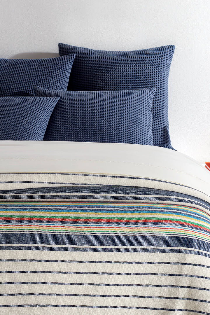 The perfect way to add a bright coastal spark to summer bed dressing is with a beautifully textured homespun cotton weave. This gorgeously soft blanket of Indigo chambray Breton stripes on a creamy Ivory ground is framed by a colorful variegated border. A casual and chic summer bed topper.