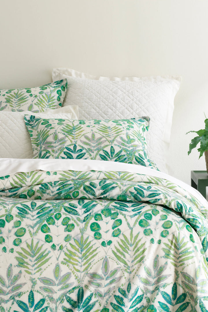 Into the woods with this forest inspired medley of verdant leaves, rendered in painterly watercolors and digitally printed for superior reproduction. Duvet cover and matching sham feature Juniper, Sprout, Misty Green and Chartreuse fanning on an ivory ground. The cotton and flax blend base cloth is specially developed for the softness and comfort of cotton with a dash of the textural drape of rustic linen. .