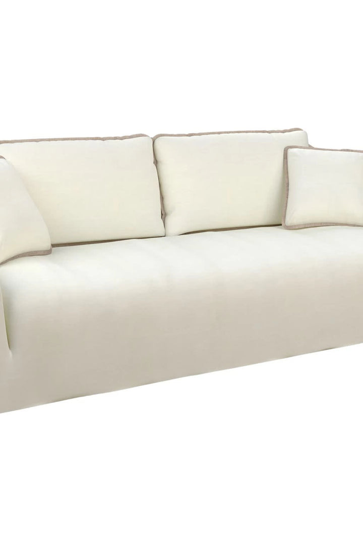 Take it easy and relax in style: Deep plump cushions and slim but curvaceous back and arms add an air of Art Deco glamour to this pared back, modern, slipcovered sofa. An ivory sofa provides a foundation for endless options of decorative pillows and its casually clean lines and easy-cleanup slipcover bring a relaxed breath of freshness to family rooms and sunrooms. <br><br> Includes two 20" x 20" throw pillows.