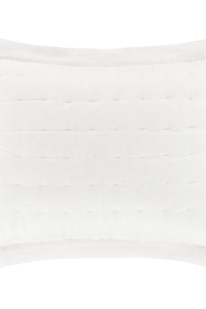 Silky smooth fabric, lofty filling, and hand-tied details make for a quilted sham of delicious warmth without the weight. The easygoing elegance of a gorgeous two-tone linen/viscose weave in a classic herringbone pattern is finished with a substantial flanged and mitered edging.