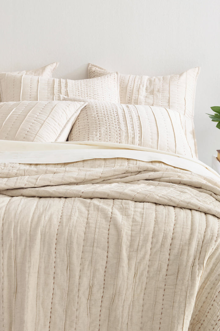 The Bryant Natural Quilt combines classic Kantha pintuck stitching with tonal color variations for a beautifully relaxed look. Crafted from soft, 100% cotton, this cozy piece layers easily and offers plenty of texture and natural charm. Pair with the matching shams to create a space that feels effortlessly inviting.