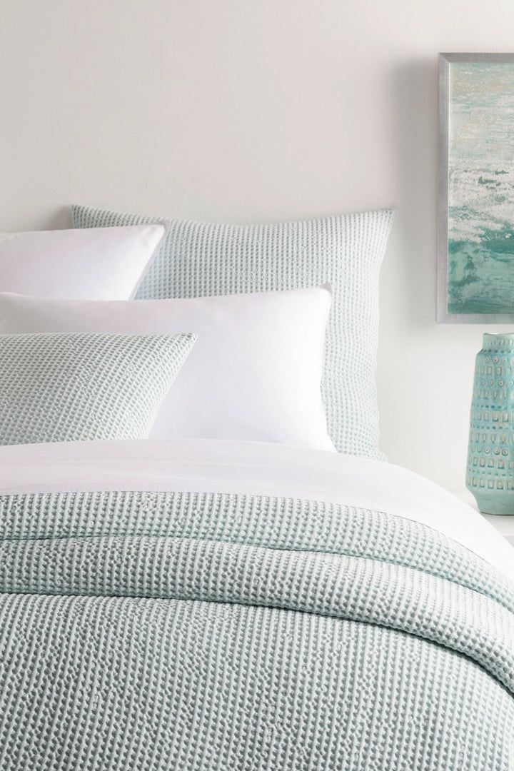 Dress your bed with our refreshed and updated cotton matelassé waffle weave for a frothy, soft look, texture and handfeel. Expertly woven in Portugal by weavers renowned for their artistry and expertise, generously sized and tailored, then stonewashed and tumbled to buttery soft laundered comfort.