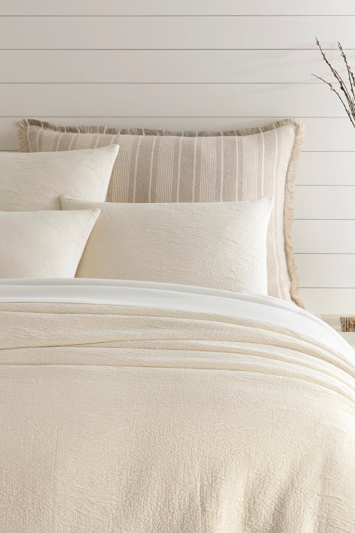A lovely deconstructed, crinkle pattern matelassé duvet cover and sham add lashings of textural wabi-sabi to a sleek white bed when paired with tailored sheets, shams, and bed skirts. Woven from cool comfy cotton, stonewashed and tumbled to buttery soft laundered comfort.