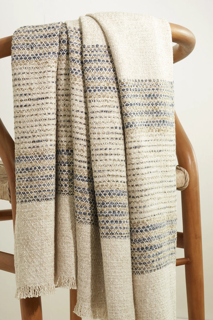 Soften your space with this lightweight yet cozy throw featuring vertical navy and olive stripes, a stylish fringe, and a versatile natural background. Made from a blend of cotton, linen, and TENCEL™, it offers the perfect balance of warmth, weight, and comfort.