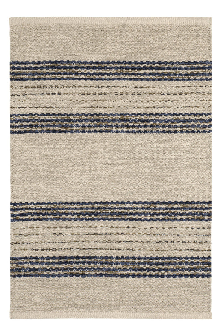This lightweight yet durable cotton rug features navy and olive stripes on a neutral background. Made with our signature flatwoven construction, it provides softness and versatility. Guaranteed to add effortless style to your space.
