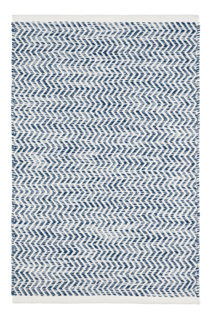 This eco-friendly and washable rug is handwoven in easy-care, soft-handed performance yarns that stay beautiful indoors and out. The marled black and ivory ground is overlaid with graphic white textured chevrons to give this classic herringbone design a new rhythm and movement. Another classic sun, rain, dog, and child-proof rug design, sustainably made from recycled water bottles with fair labor practices.
