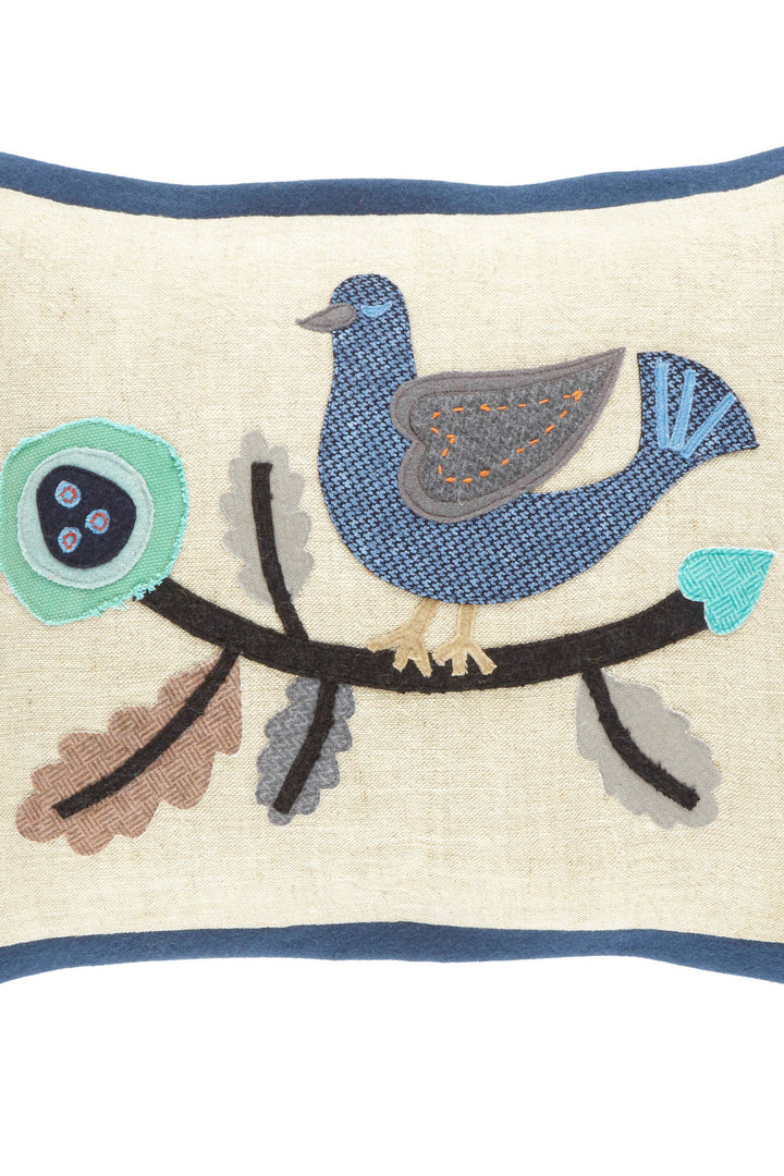 Part of our collaboration with Kit Kemp. This darling decorative pillow features a nature-inspired motif that Kit often uses in her interiors. Each piece, from the tiny bird beak to the little eggs nestled in the nest, is hand-cut from high-quality wool felt and stitched into place on a 100% linen background. A blue banded border completes the look.