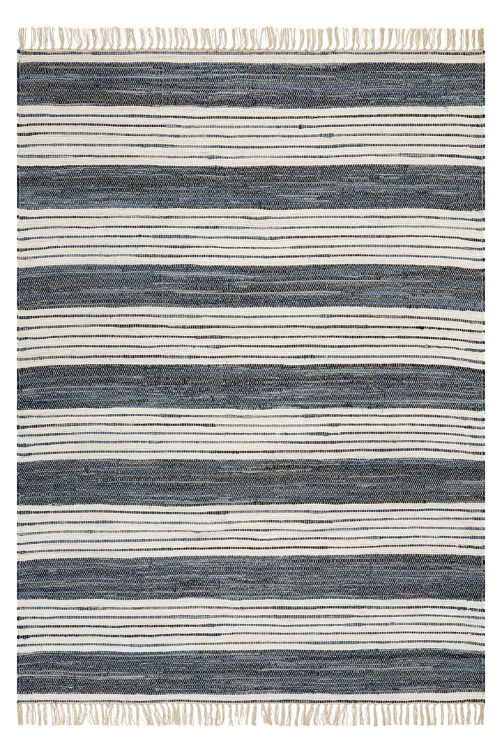 Layered bands of denim and natural light move across the surface with understated balance. A handwoven construction adds tactile depth, finished with soft fringe for an easy, elevated edge.