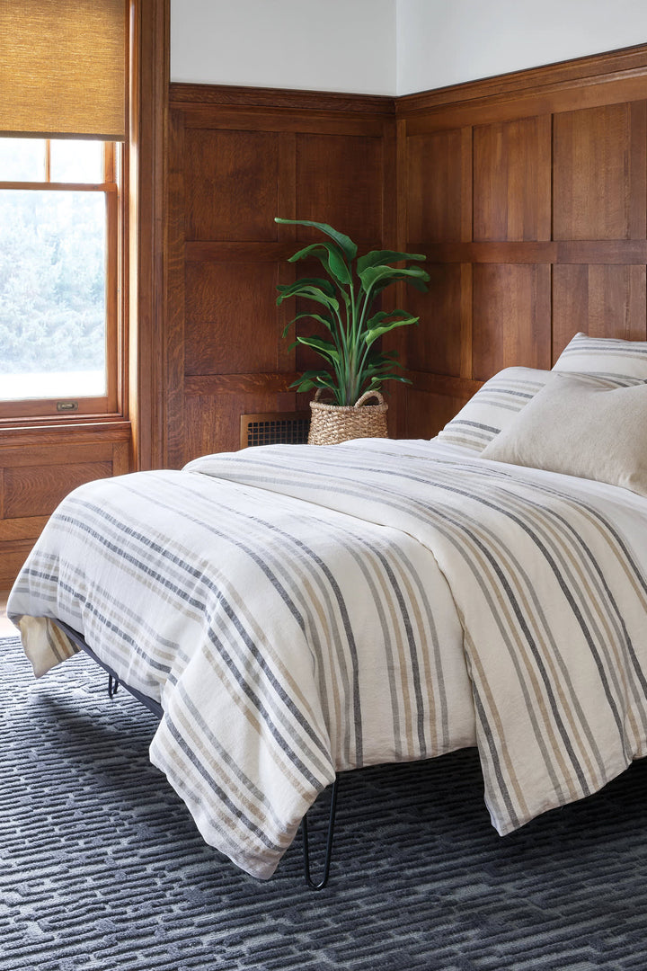 Soft to the touch with a fantastic drape, our luxurious linen chenille sham cover adds a modern graphic edge in Charcoal, Grey, and Natural stripes on Ivory. The subtle sueded texture is woven from velvety chenille yarn in a fantastic blend of cotton for softness, linen for texture and strength, and viscose for a silky drape.