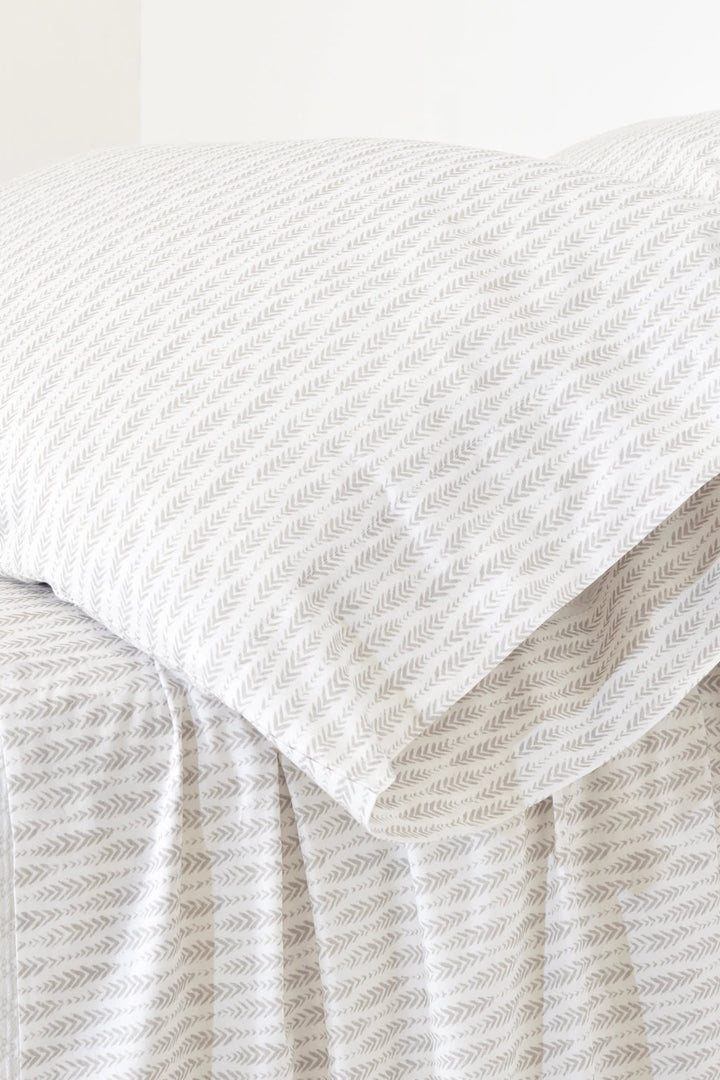 Meet the Feather Ogee Sheet Set—a playful twist on classic percale. Inspired by classic block printing, the crisp white background and repeating feather pattern add a subtle yet stylish flair to your bed. These sheets layer effortlessly with many of our blankets and top-of-bed covers, plus they get softer with every wash.