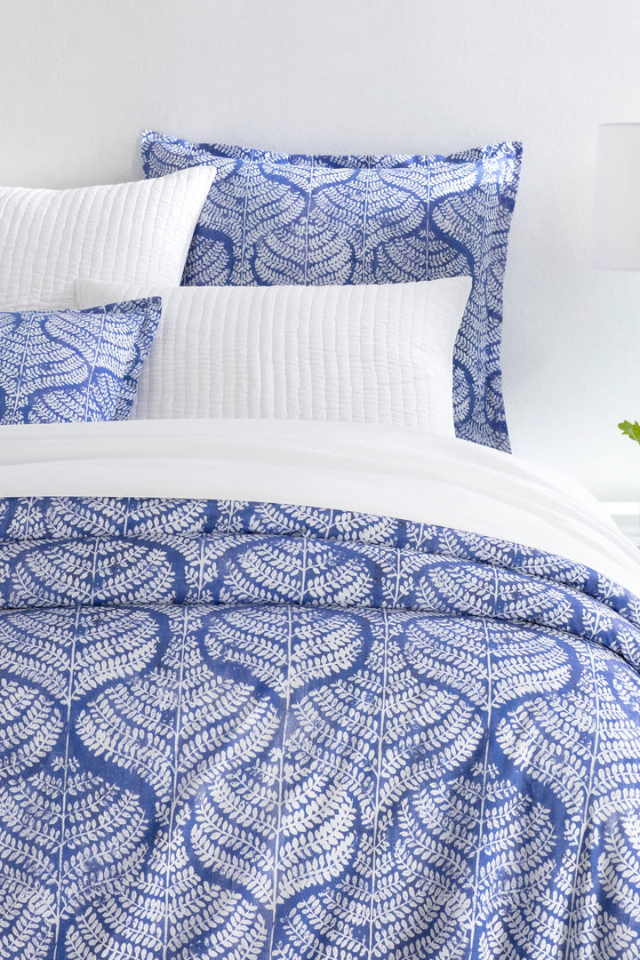 Bold botanical ecru ferns pop against a cobalt ground in this gorgeous print reminiscent of resist-dyed South Asian textiles. This crisp cotton percale bedding pairs beautifully with a variety of hues from natural to deep blue, making it a natural choice for successful mixing, matching, and layering.