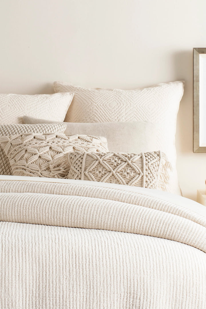 Lofty and light, woven to look and feel like the softest of sweaters, the Hoyt blanket sports organic parallel ridges of tucked ribs. An extra layer for your bed in buttery soft-to-the-skin cotton. 1" self fringe on 3 sides. .