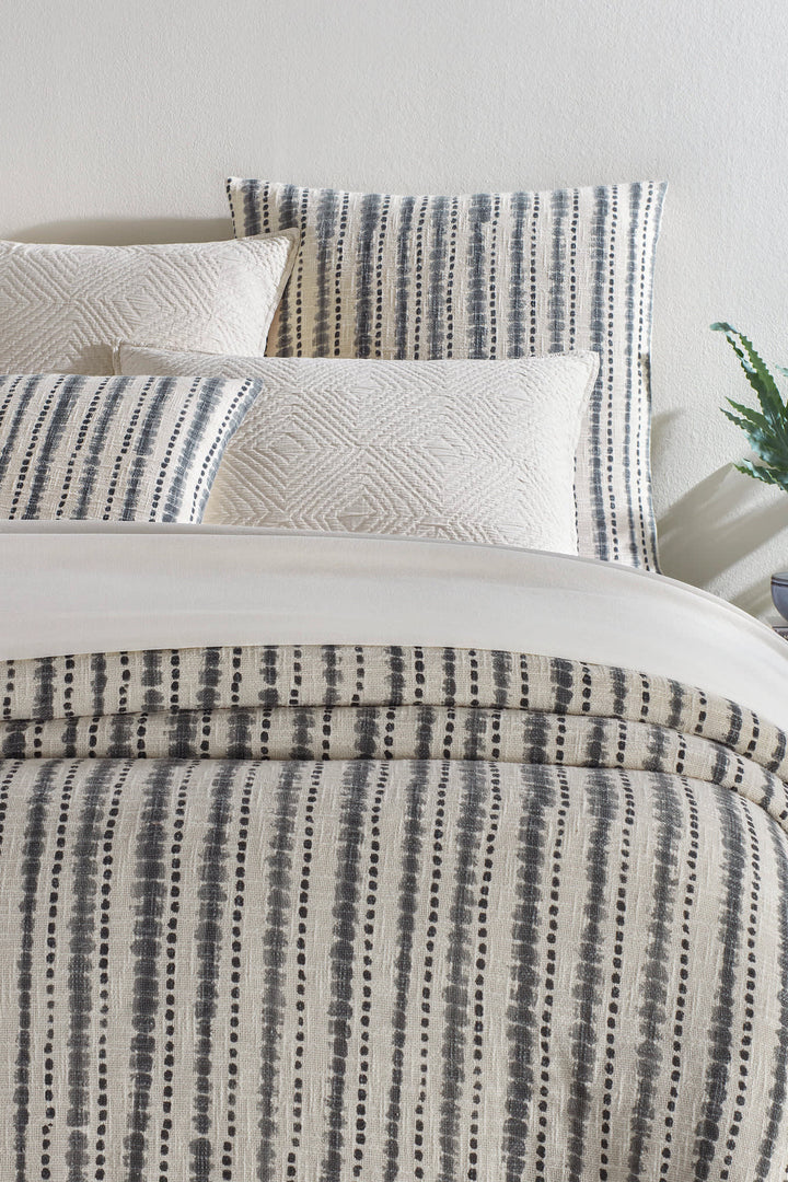 Inky stripes of watercolor dots in neutral Grey and Black on a rustic cotton background make for a calming yet modern duvet cover. The slubby woven texture of the cloth will feel soft and cozy against your skin.