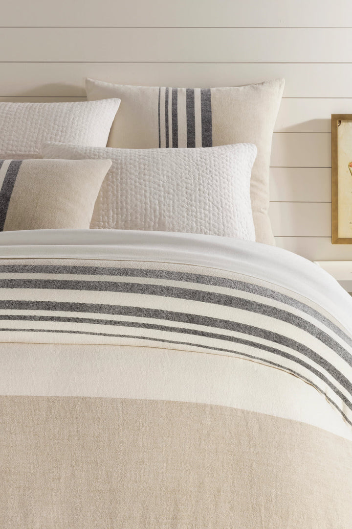 Stay calm and serene without being bored. Our large scale block stripe adds a graphic edge in Ivory, Charcoal and Natural to a modern, minimalistic bedroom. Soft to the touch with a fantastic drape, our luxurious linen chenille bedding will give your bed a hint of glamour. Woven from velvety chenille yarn in a fantastic blend of cotton for softness, linen for texture and strength and viscose for additional drape and a subtle light effect. This duvet and matching sham has a subtle woven texture unlike any other fabric.