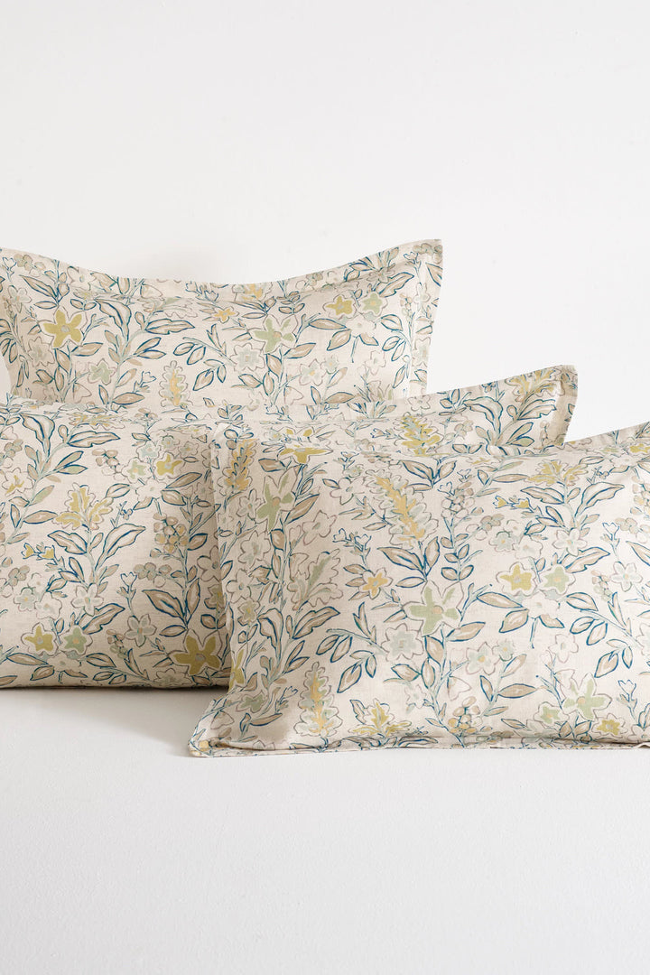 Bring a breath of fresh air to your bedroom. Inspired by a one-of-a-kind watercolor painting our designers discovered and loved, this botanical print weaves sage, sky, and navy florals across a soft cotton/linen flax blend. The natural, undyed background adds an effortlessly chic touch.