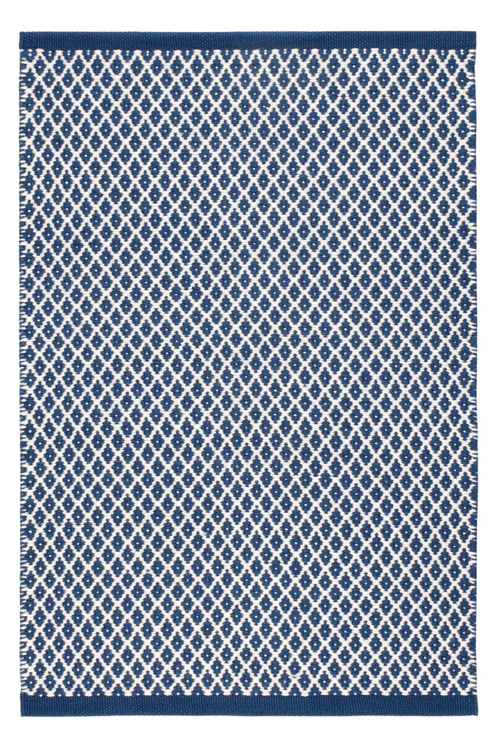 A classic lattice diamond in versatile blue and ivory color combo offers subtle geometric interest on a durable and washable floor covering. Made of eco-friendly 100% PET, a soft-handed fiber from recycled plastic bottles.