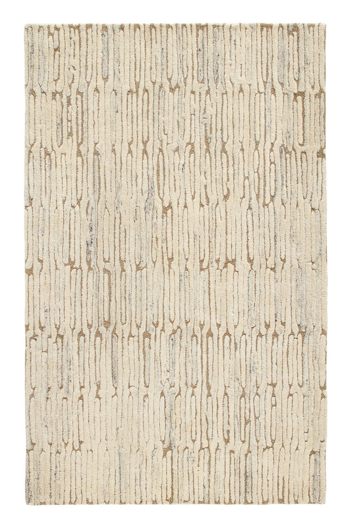 Luxuriously plush, this wool rug's subtle beauty suggests eroded coastal cliffs, whose substrate layers chronicle the passage of time. The pattern is additionally emphasized by higher sheared tufts that contrast in color, sheen, and texture with dense and low looped stripes. A natural undyed fleece pile enhances the finely observed irregular striations. With modern and traditional elements, this sophisticated hand-knotted wool rug demonstrates unique textures found in nature. Offered in a sophisticated palette of chalky tones and mineral-rich neutrals. Designed for us by Marie Flanigan, an award-winning interior designer, to reflect her signature style of timeless elegance and innovative simplicity.