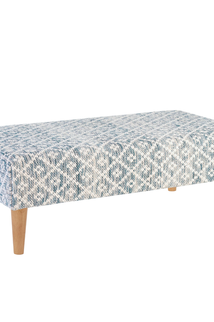 A customer favorite, our picture-perfect Melange Diamond Handwoven Cotton Rug is now reimagined and upholstered as a contemporary collectible ottoman. Its intricate, eye-catching motif - a classic diamond pattern made with a faded melange of monochromatic mineral blues - is ideal in any setting, from coastal to cottage, modern to traditional. This cushioned ottoman is held aloft by a choice of shapely turned-wood legs in a variety of finishes. An ideal placement for front of sofa or end of bed, doing double duty as occasional seating and staging area for a tray. This supersmart addition to entryway, living room or bedroom is a versatile investment piece, available in two sizes.