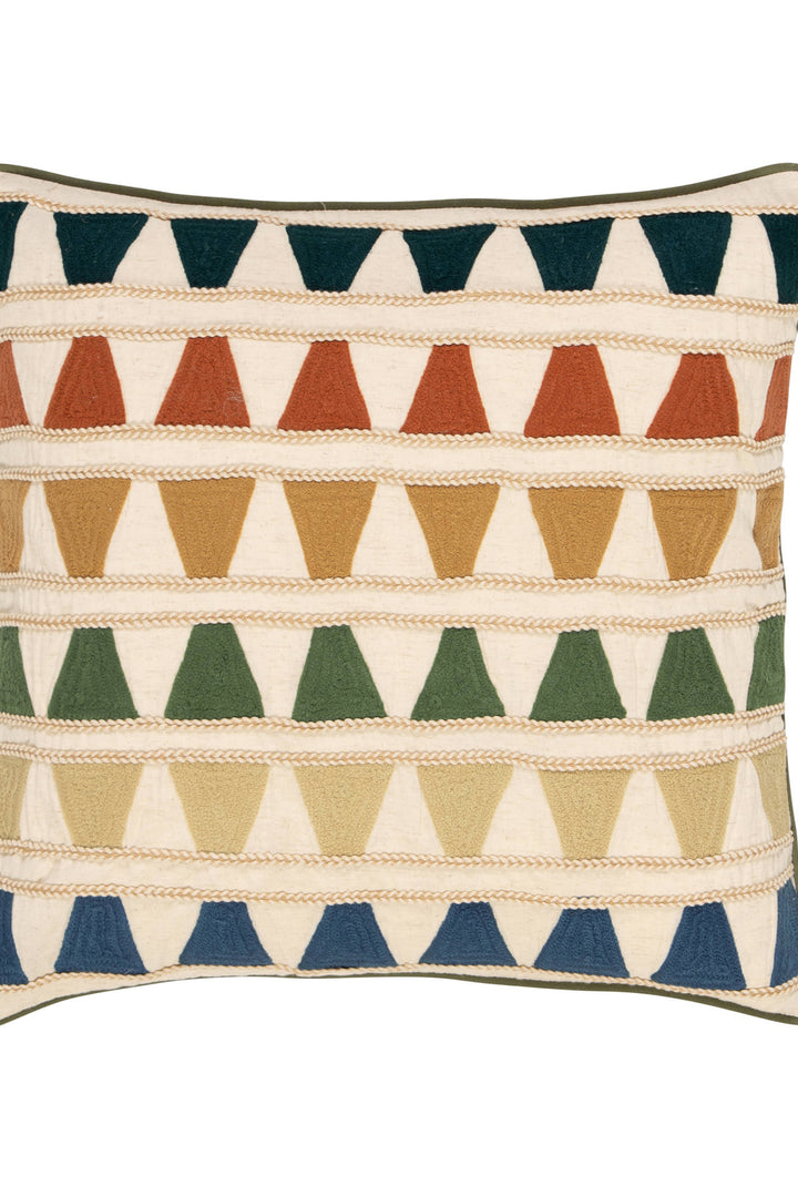 Artful and eye-catching, the Montello Pillow features geometric embroidery on a soft cotton-linen blend. Its bold, colorful design brings a boho flair to your pillowscape. Perfect for those who love statement accents.