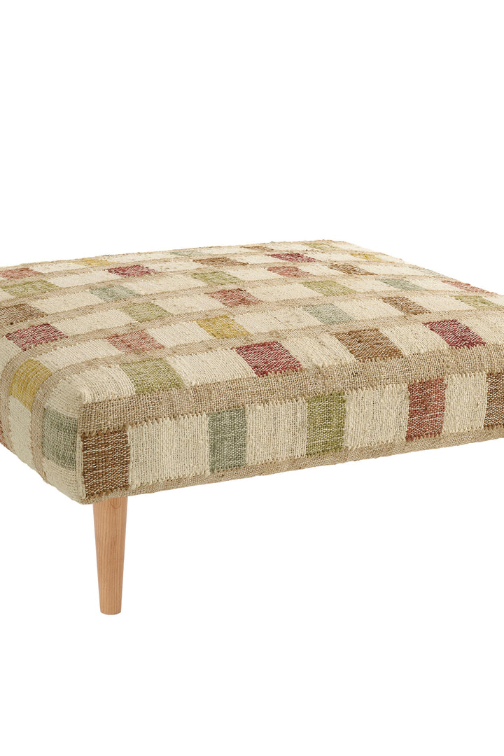 Our finely textured, low-profile jute rug - Mosaic Handwoven Jute Rug - now beautifully reimagined and upholstered as a stunning contemporary ottoman. Expertly handwoven in a modern, multi-check grid of natural, seaglass, denim, navy, and juniper blocks on ivory. Woven in hardworking jute with a touch of cotton for softness, this cushioned ottoman is held aloft by a choice of shapely turned-wood legs in a variety of finishes. An ideal placement for front of sofa or end of bed, doing double duty as occasional seating and staging area for a tray. This supersmart addition to entryway, living room or bedroom is a versatile investment piece, available in two sizes.