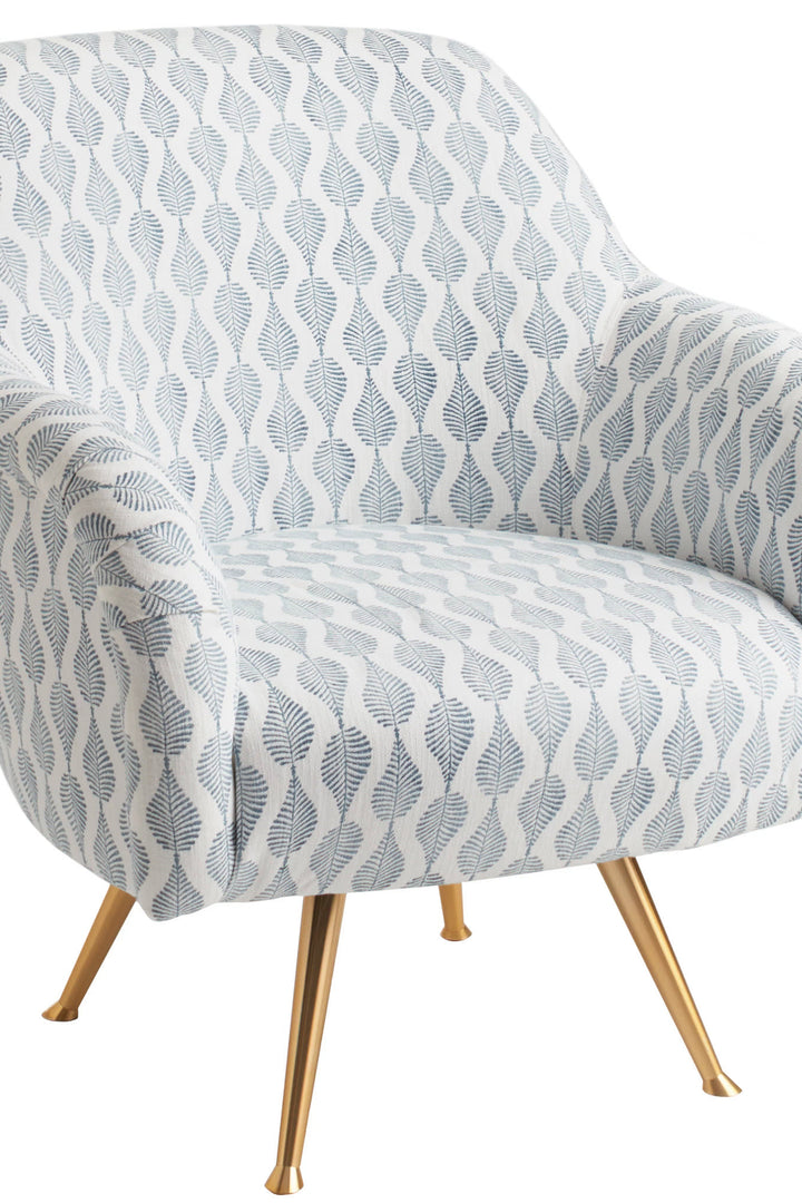 As comfortable as it is stylish, this curvy swivel chair has a retro wrap-around shape perched atop Mid Century legs. Upholstered in a crisply textured cotton and linen blend fabric with a repeating pattern of ferny fossils on an ecru ground. An easy addition to the bedroom or sitting room, it blends seamlessly with any style of decor. Made in the USA.