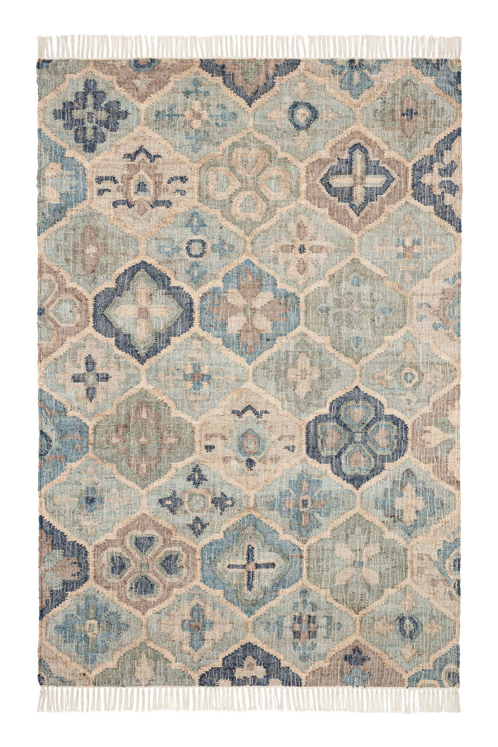 Timeless quatrefoil medallions in shades of sky, denim, natural and ivory, dhurrie woven from hardworking jute, with a touch of cotton for softness. Sustainable, biodegradable and renewable, jute adds orglamic character and rustic chic to any room.