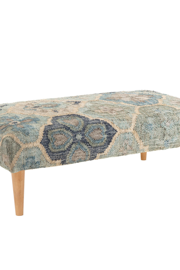 Love our Pali Handwoven Jute Rug? Reimagined and upholstered from one of our favorite rugs, this ottoman becomes a contemporary collectible. Attractively upholstered in quatrefoil medallions in shades of terracotta, denim, natural and ivory, woven in hardworking jute, with a touch of cotton for softness. The cushioned ottoman is held aloft by a choice of shapely turned-wood legs in a variety of finishes. An ideal placement for front of sofa or end of bed, doing double duty as occasional seating and staging area for a tray. This supersmart addition to entryway, living room or bedroom is a versatile investment piece, available in two sizes.