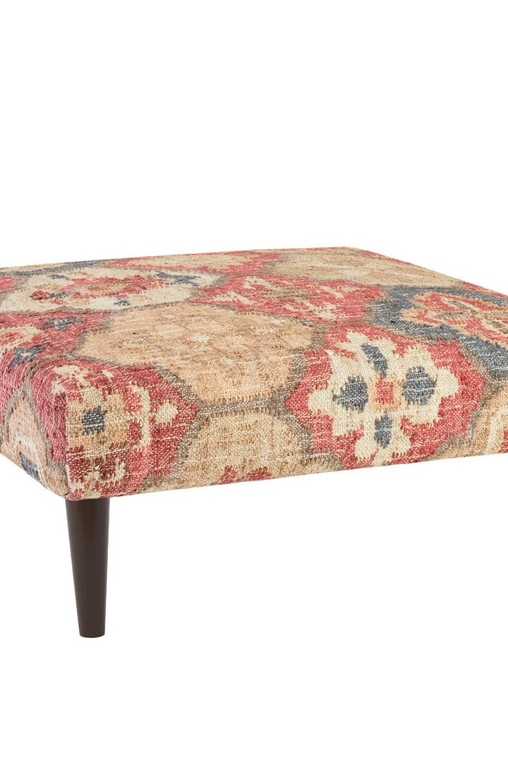 Love our Pali Handwoven Jute Rug? Reimagined and upholstered from one of our favorite rugs, this ottoman becomes a contemporary collectible. Attractively upholstered in quatrefoil medallions in shades of terracotta, denim, natural and ivory, woven in hardworking jute, with a touch of cotton for softness. The cushioned ottoman is held aloft by a choice of shapely turned-wood legs in a variety of finishes. An ideal placement for front of sofa or end of bed, doing double duty as occasional seating and staging area for a tray. This supersmart addition to entryway, living room or bedroom is a versatile investment piece, available in two sizes.