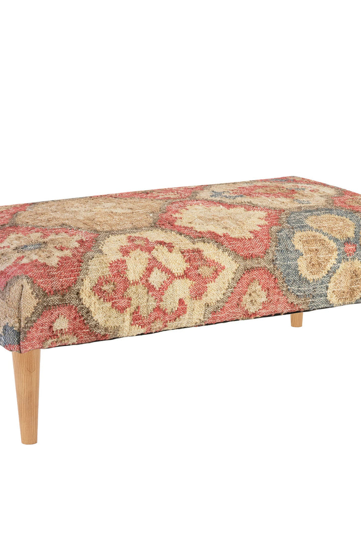 Love our Pali Handwoven Jute Rug? Reimagined and upholstered from one of our favorite rugs, this ottoman becomes a contemporary collectible. Attractively upholstered in quatrefoil medallions in shades of terracotta, denim, natural and ivory, woven in hardworking jute, with a touch of cotton for softness. The cushioned ottoman is held aloft by a choice of shapely turned-wood legs in a variety of finishes. An ideal placement for front of sofa or end of bed, doing double duty as occasional seating and staging area for a tray. This supersmart addition to entryway, living room or bedroom is a versatile investment piece, available in two sizes.